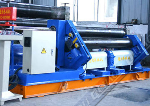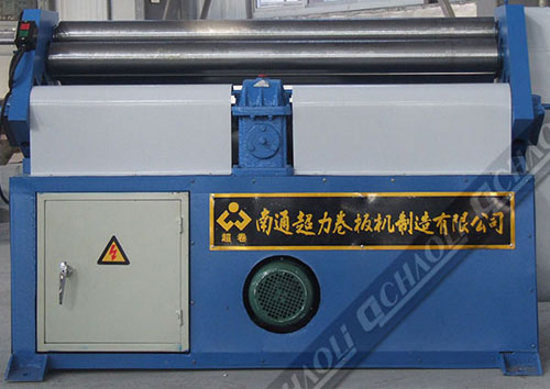 該機(jī)結(jié)構(gòu)型式為三輥非對稱式,下輥為主傳動,并做垂直升降運(yùn)動,以便夾緊板材。通過下輥齒輪與上輥齒輪嚙合,同時(shí)作為主傳動,側(cè)輥?zhàn)鲀A升降運(yùn)動。具有預(yù)彎、卷圓多重功能,結(jié)構(gòu)緊湊操作維修方便。