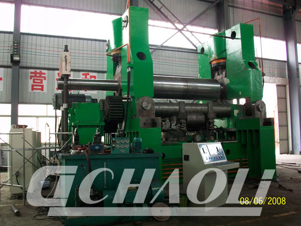 卷圓時(shí)通過電動(dòng)機(jī)、減速機(jī)帶動(dòng)兩下輥進(jìn)行。由于下輥的標(biāo)高不變,所以便于進(jìn)料和操作。